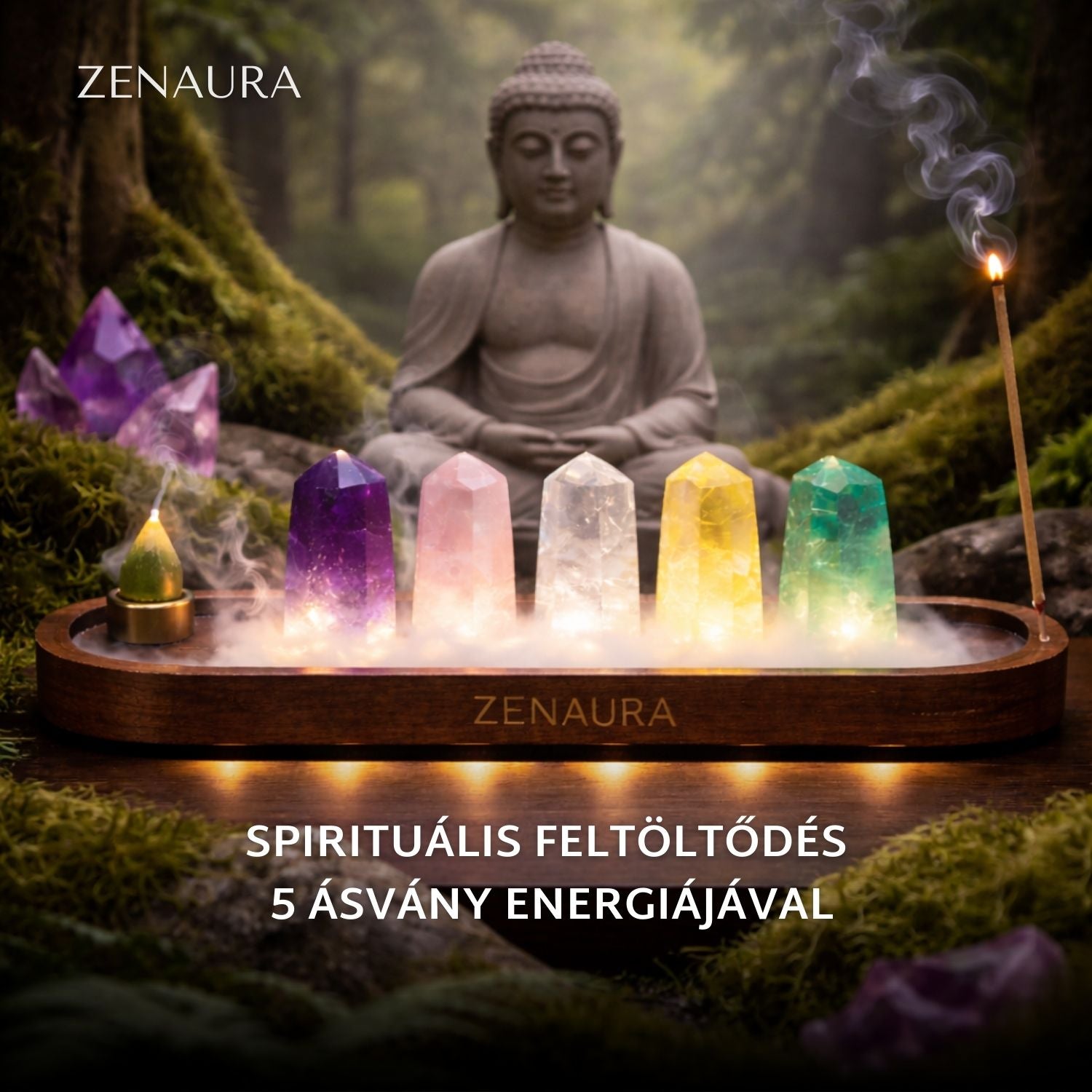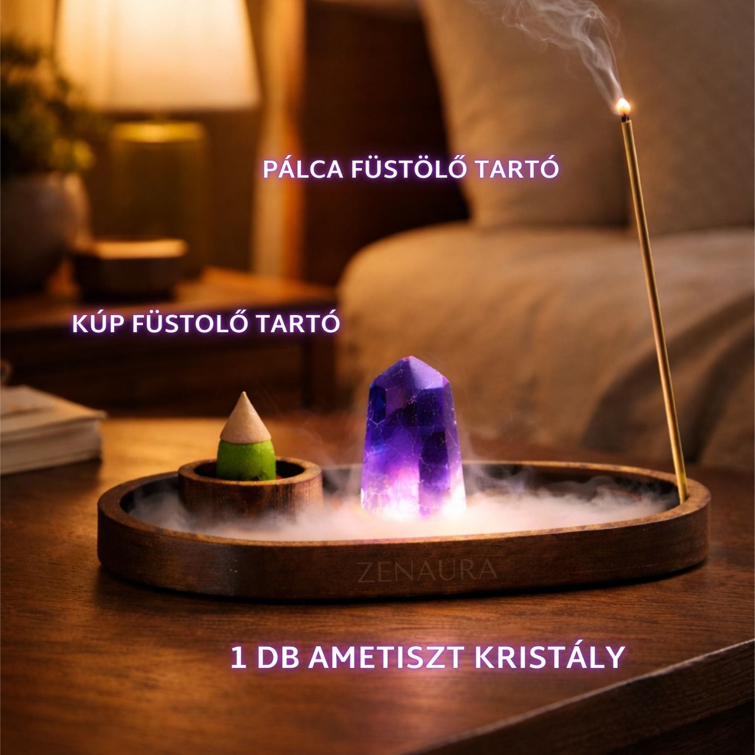 Természetes fából készült, kristályközpontú füstölőtartó, amely elegáns fókuszponttá válik bármely térben. A peremes kialakítás felfogja a hamut, miközben a füst látványosan körbeöleli a központi kristályt.