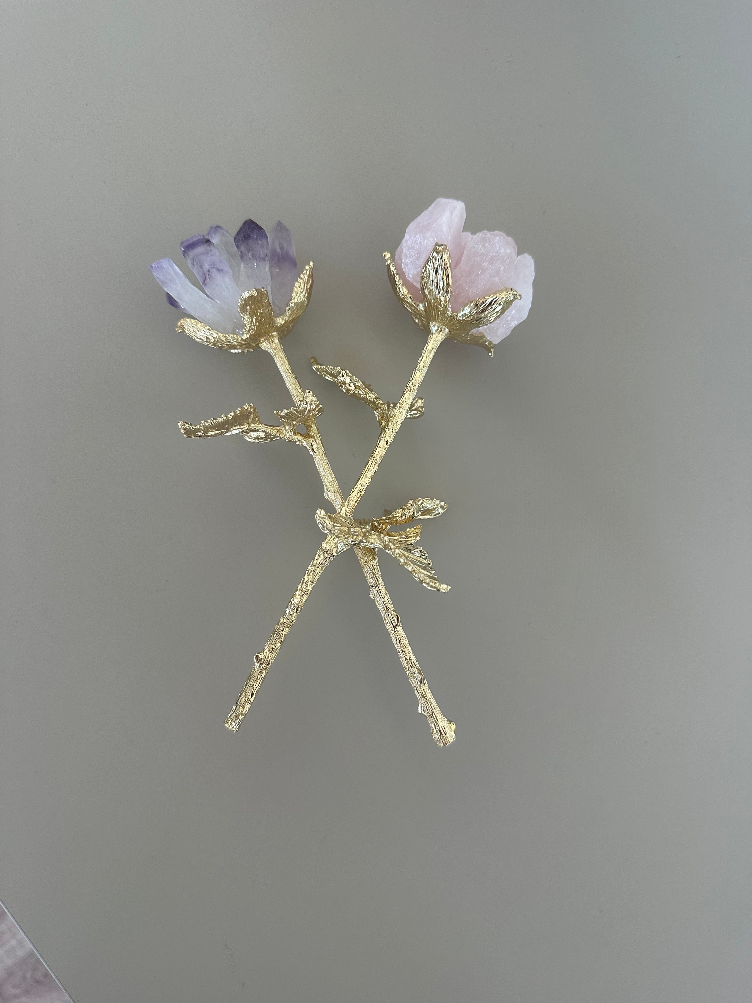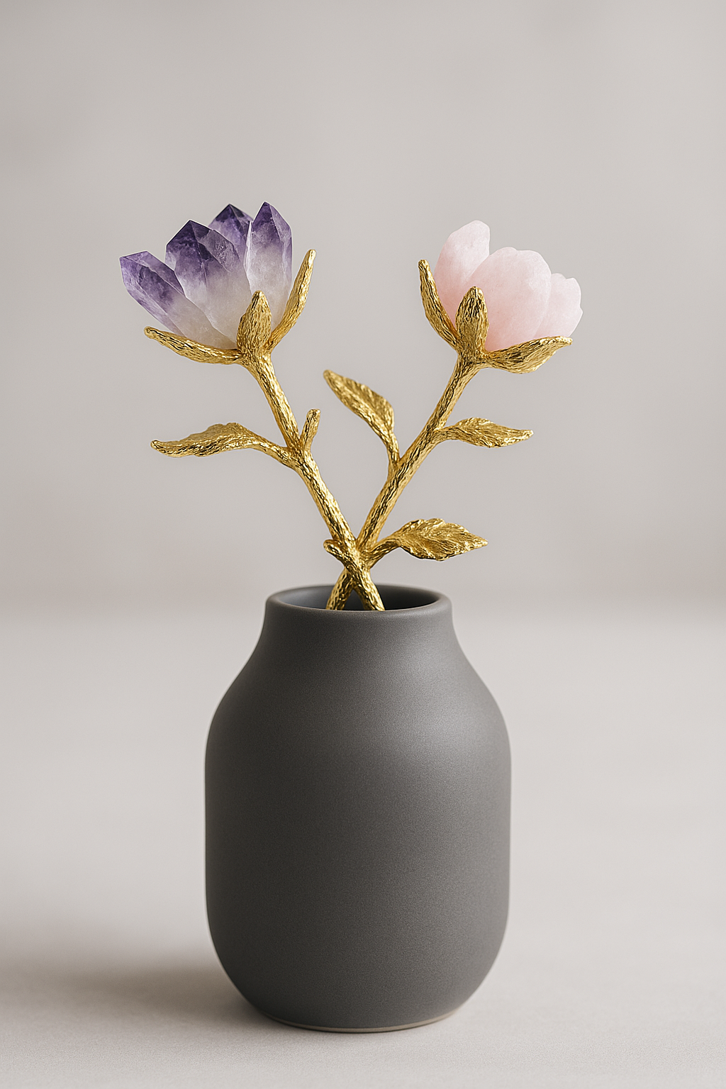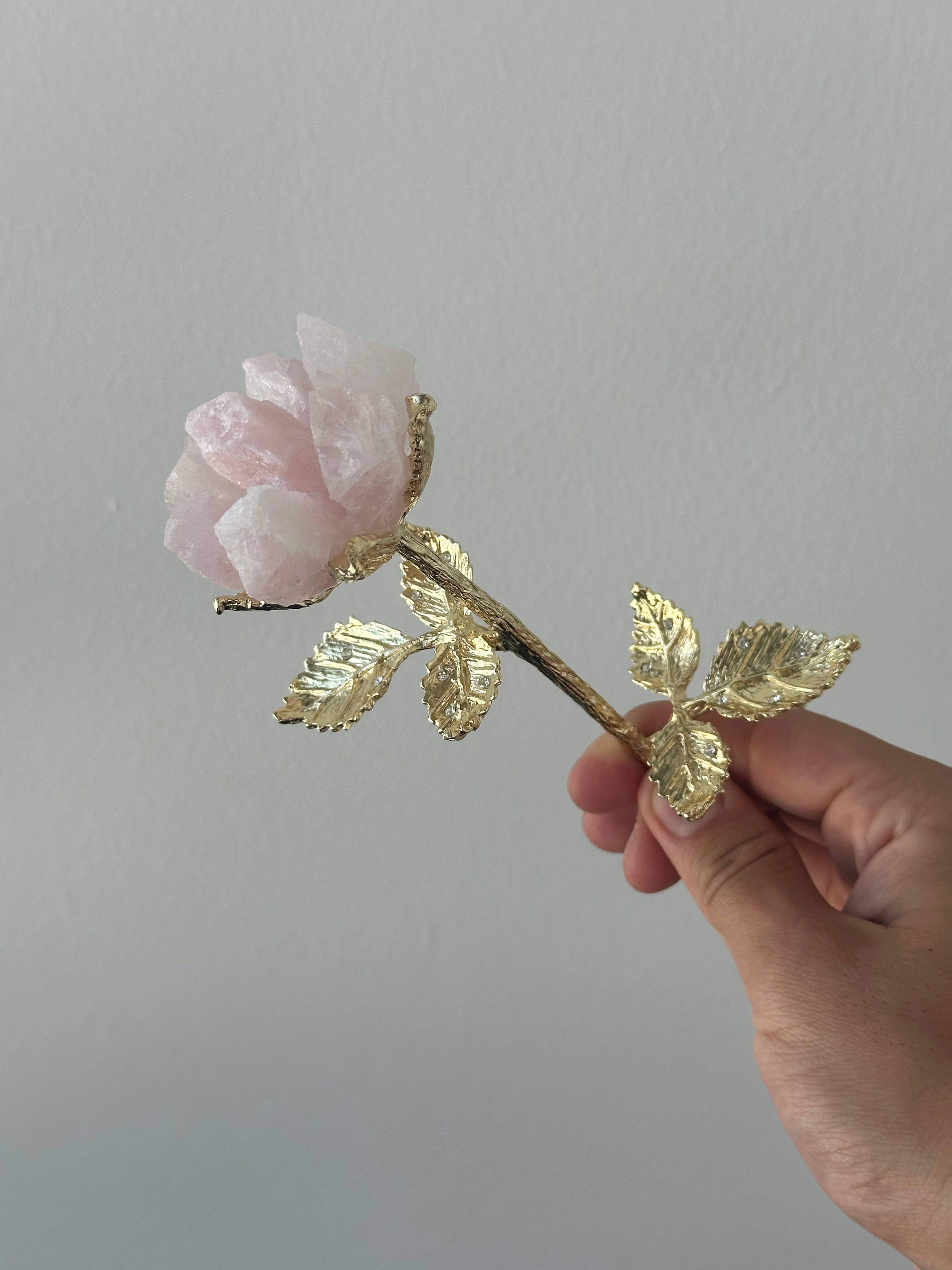 Ez a kézzel készült díszrózsa valódi rózsakvarcból/ ametisztből faragott szirmokkal és aranyszínű, részletgazdag fém szárral készült. A rózsakvarc és ametiszt a szeretet és harmónia köve, így ez a rózsa tökéletes ajándék különleges alkalmakra vagy elegáns lakásdekorációnak.