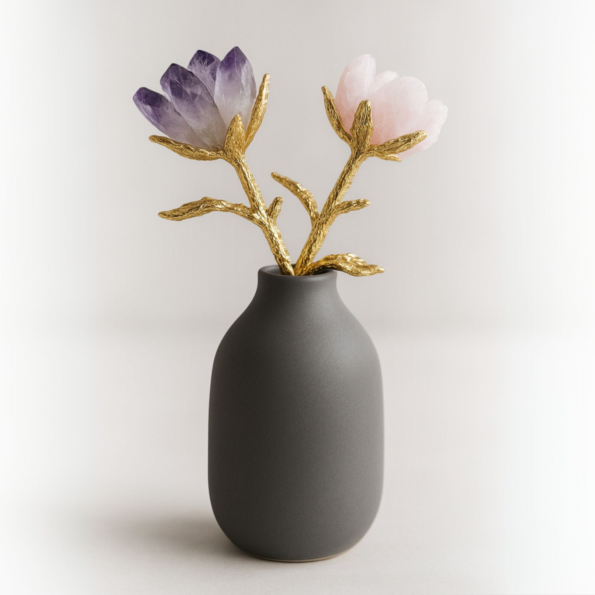 Ez a kézzel készült díszrózsa valódi rózsakvarcból/ ametisztből faragott szirmokkal és aranyszínű, részletgazdag fém szárral készült. A rózsakvarc és ametiszt a szeretet és harmónia köve, így ez a rózsa tökéletes ajándék különleges alkalmakra vagy elegáns lakásdekorációnak.
