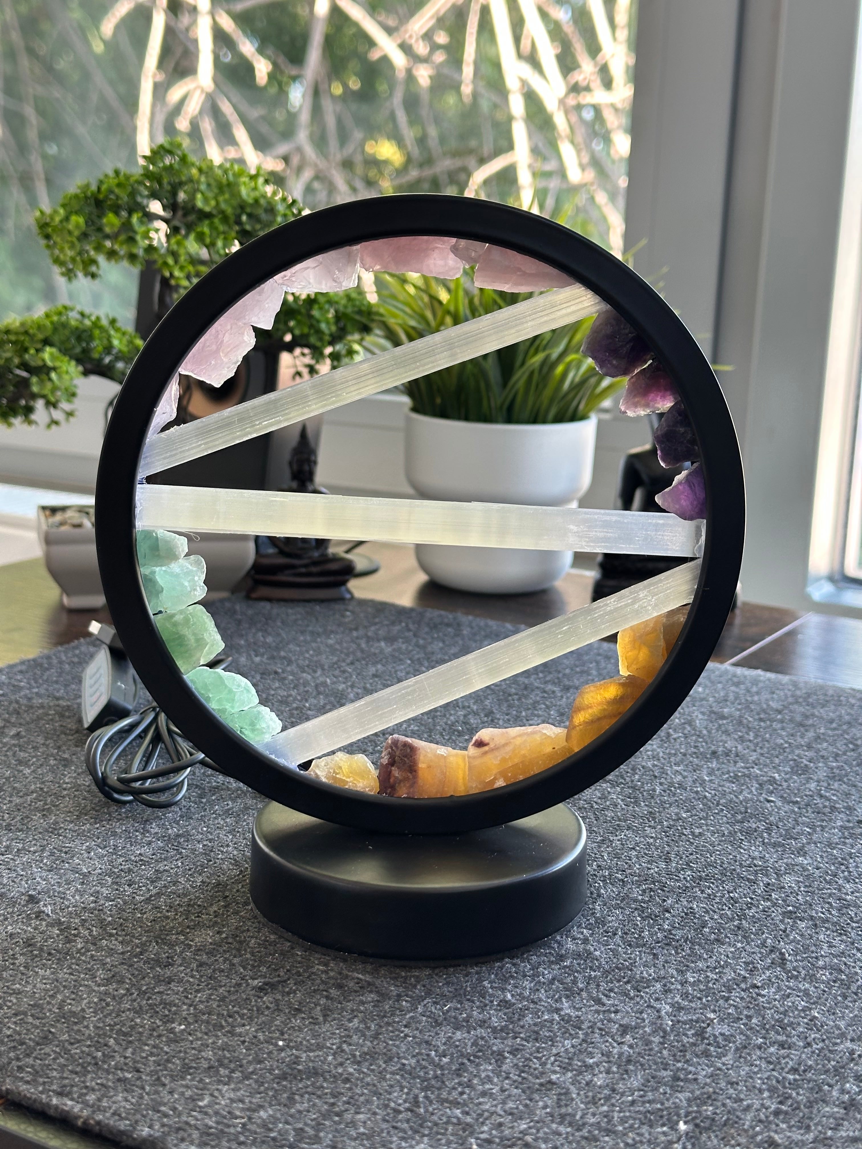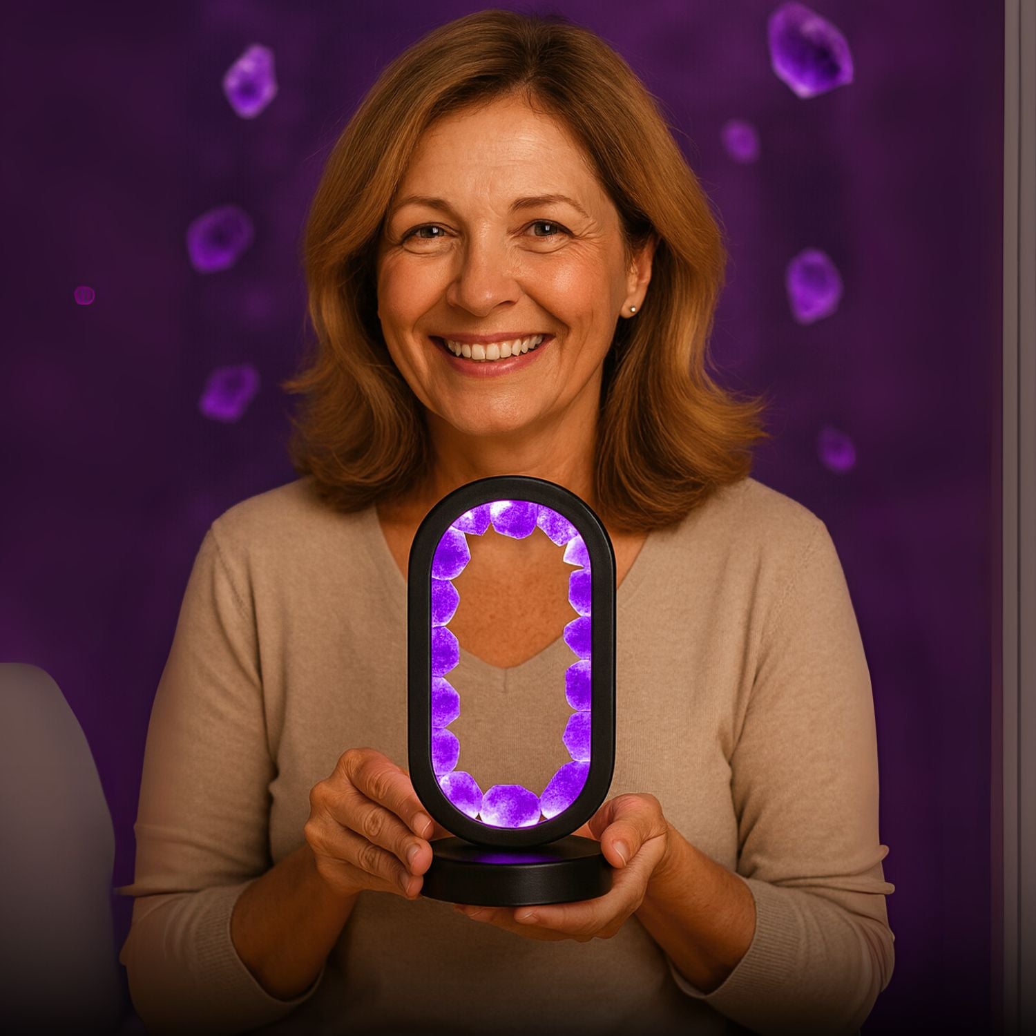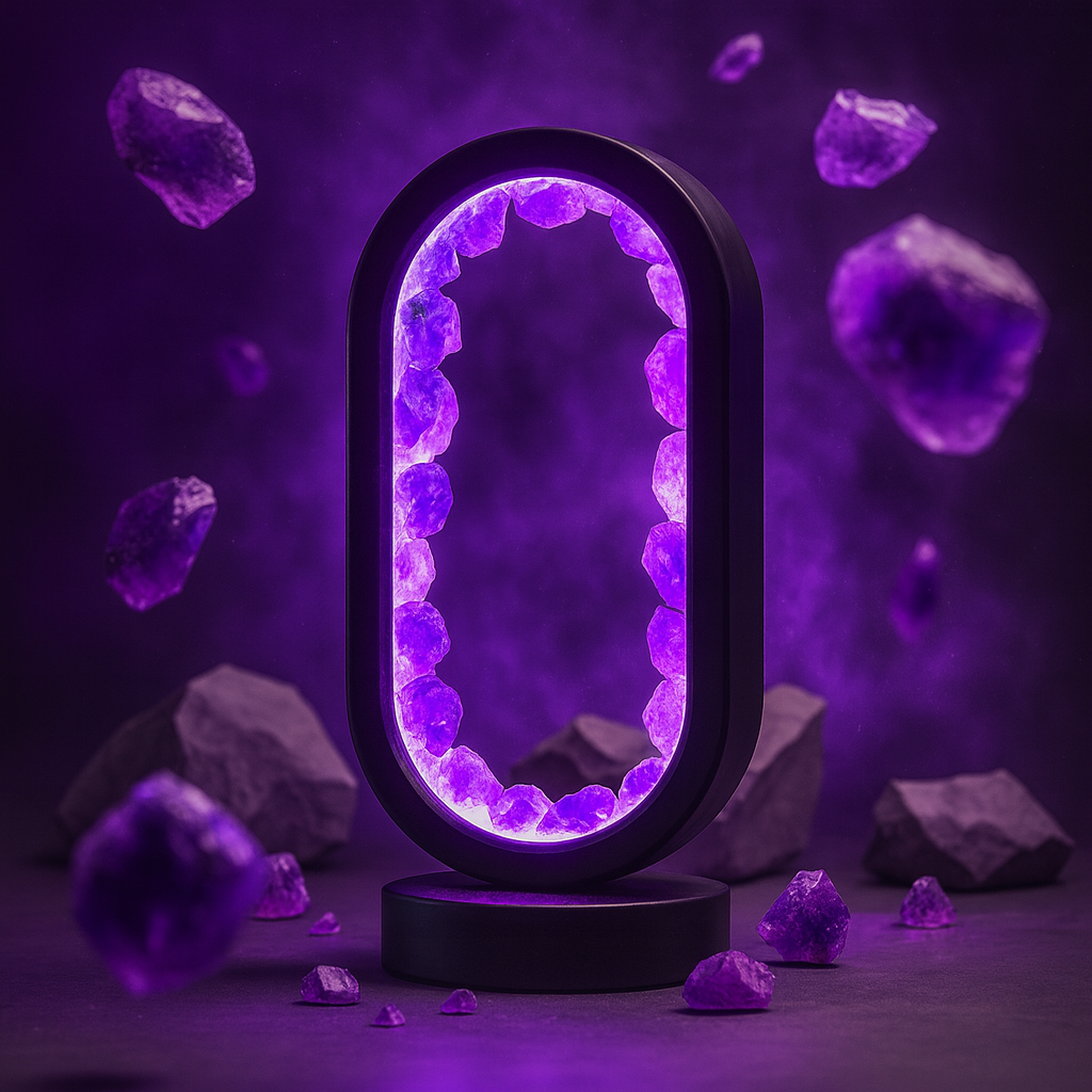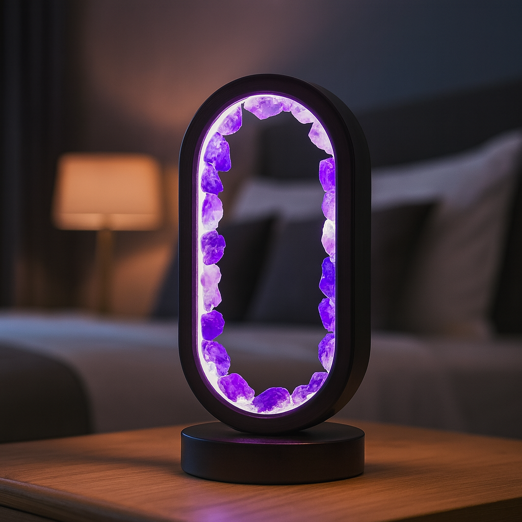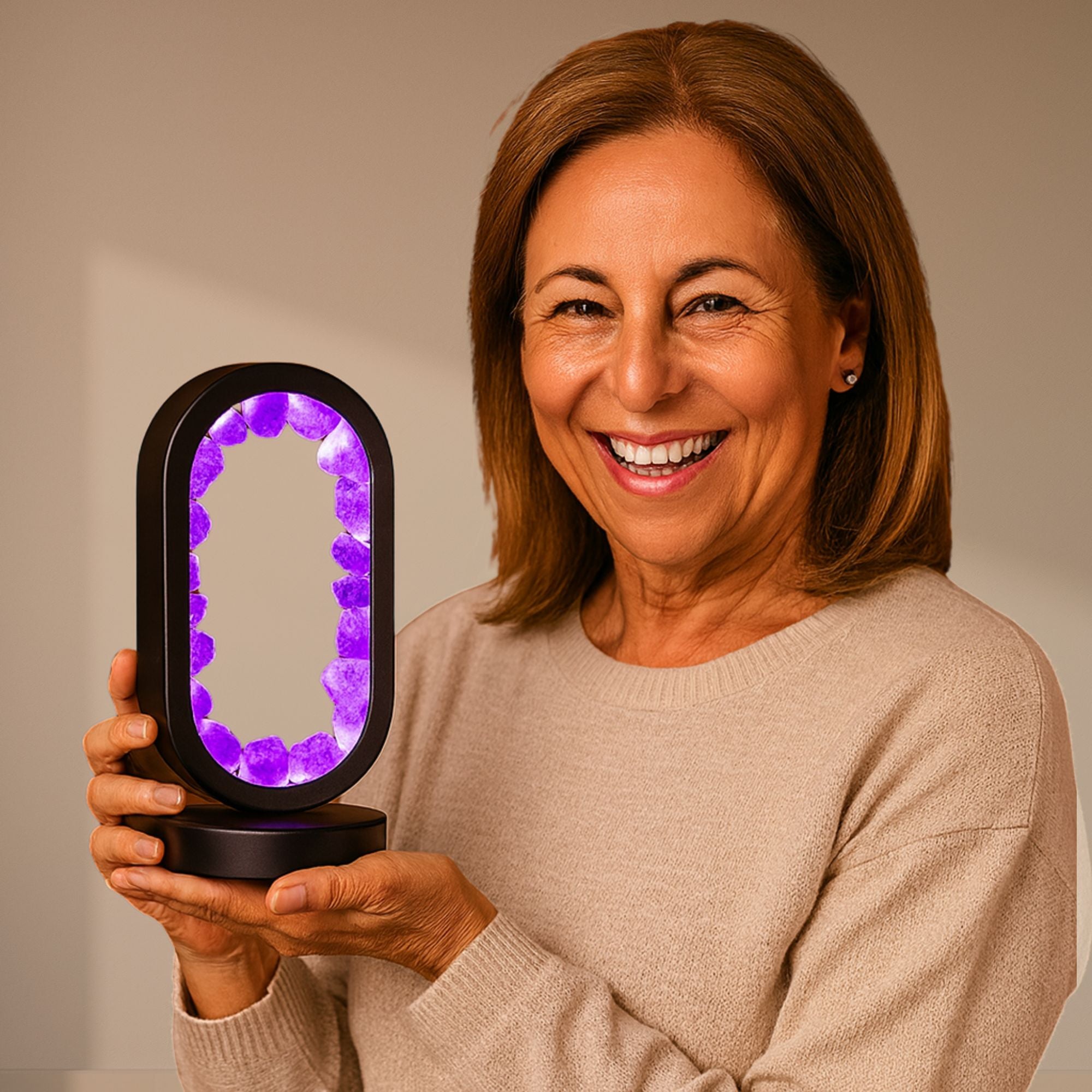 Ennek eredményeként a lámpa kiegyensúlyozott, szeretetteljes és nyugtató légkört teremt, a fluoritok, a rózsakvarc és az ametiszt összes jó tulajdonságát felhasználva.